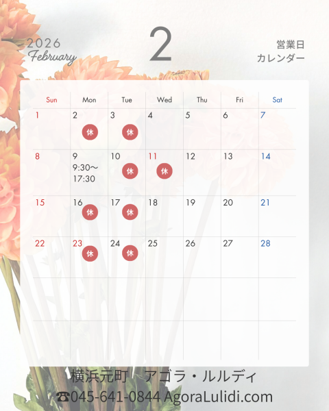 2/2(月)、11(水・祝)、16(月)、22(月・祝)はお休みです。