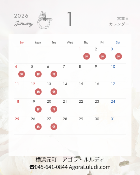 1/5(月)、12(月・祝)、19(月)、26(月)はお休みです。